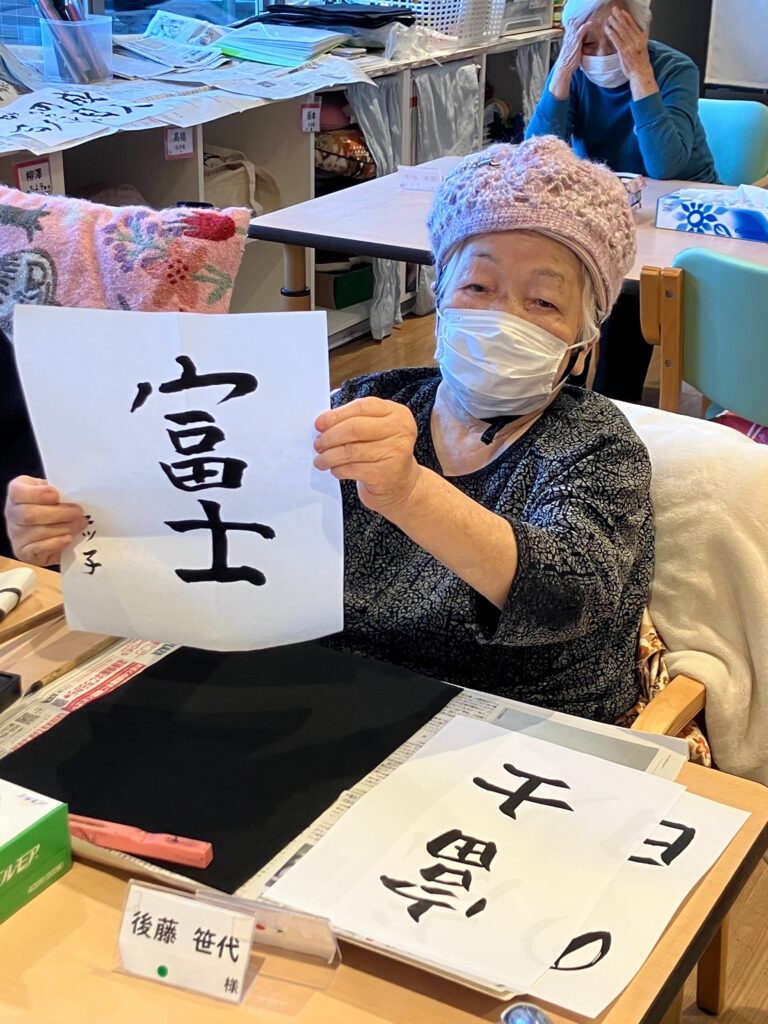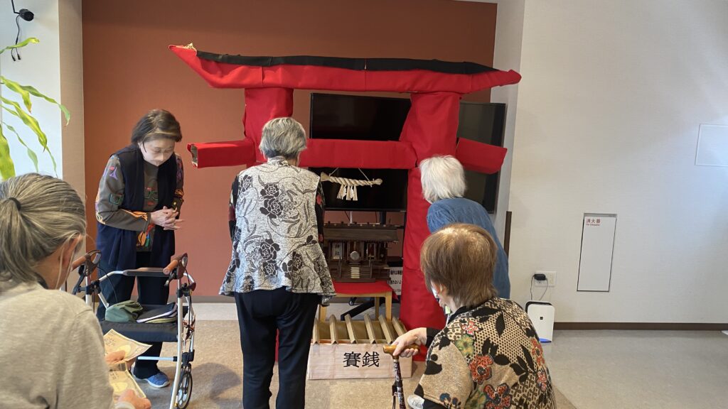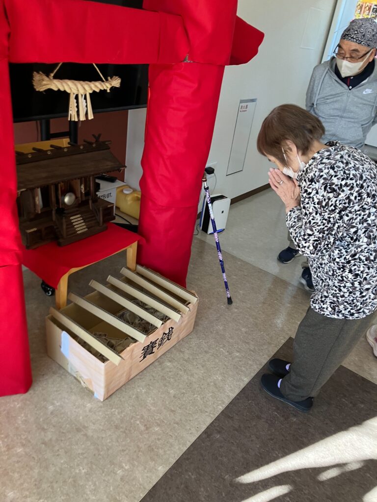 2026/01/01 あけましておめでとうございます 新年あけましておめでとうございます。 日頃より当施設の運営に多大なるご支援をいただき、心より御礼申し上げます。 本年もさらなるサービスの向上に努めてまいりますので、どうぞよろしくお願い申し上げます。 新しい年を迎え、初詣参りをしました。 今年も一年、健康に過ごせますようにとお願いされていました。 年始めにレクリエーションで鏡開きを行い、書初めをしました。